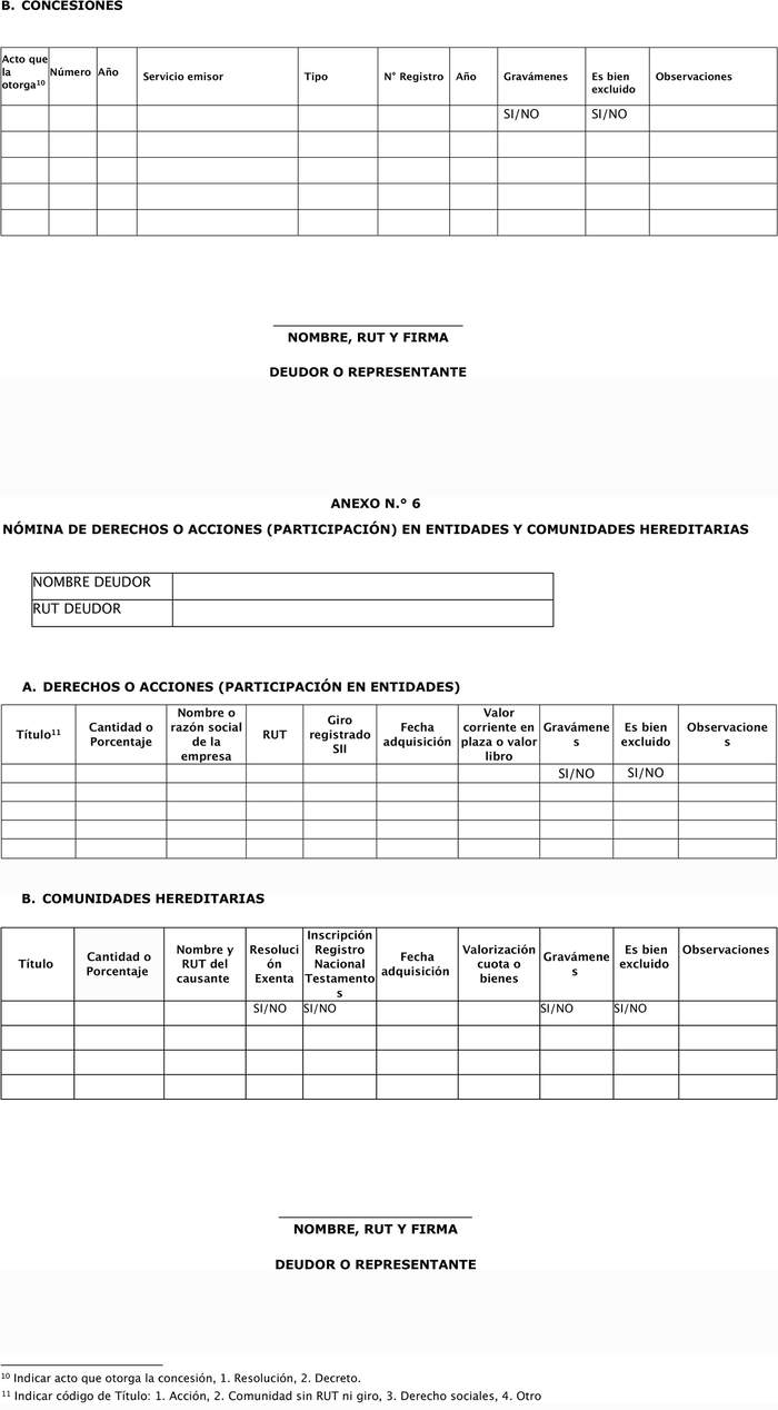 a.3 Derechos de aprovechamiento de aguas y concesiones: deberá informar los derechos de aprovechamiento de aguas y/o concesiones de los que el deudor sea titular, indicando el acto que lo otorga y los datos del registro, según modelo contenido en el Anexo N° 5.