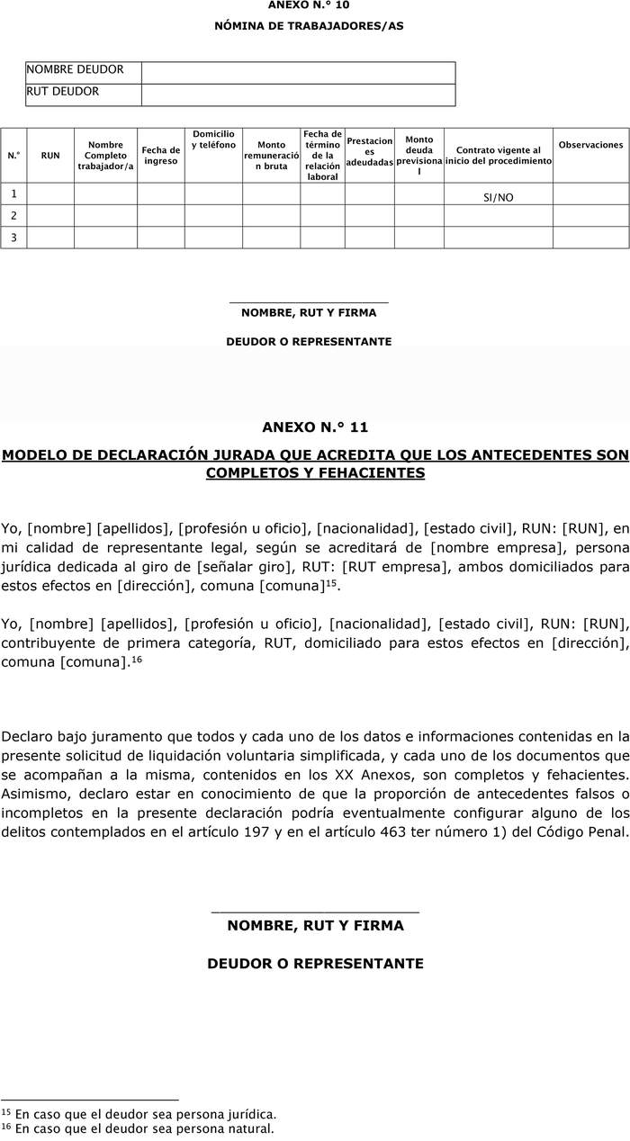 Junto a la respectiva solicitud de liquidación voluntaria simplificada, el deudor deberá adjuntar una declaración jurada suscrita por el deudor o su representante, en la cual se indique que los antecedentes y documentos que se adjuntan a esta solicitud de inicio del Procedimiento Concursal de Liquidación Voluntaria Simplificada son completos y fehacientes, conforme a modelo contenido en el Anexo N° 11.