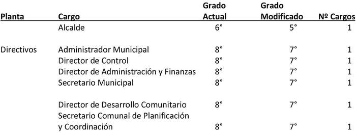 Artículo 1°: De conformidad a lo establecido en los artículos 49 bis, 49 quáter y 49 quinquies de la Ley N° 18.695, Orgánica Constitucional de Municipalidades; Modifícase la Planta de Personal de la Municipalidad de Contulmo, como indica: