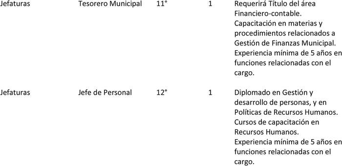 11.- Que, en relación al cargo de Tesorero Municipal, de acuerdo a lo preceptuado por la jurisprudencia administrativa del órgano contralor, contenida entre otro en el dictamen N° 3.705, de fecha 19 de enero de 2012, para "los fines del cumplimiento de las labores propias de la jefatura de la unidad encargada de tesorería municipal, la municipalidad debe proceder a la asignación o encomendación de tales tareas, a un servidor que integre algunas de las plantas que pueden ejercer funciones de dicha naturaleza, esto es, directiva o jefatura". Actualmente la función de Tesorero Municipal se realiza con decreto que asigna la función a funcionaria del escalafón Técnico, grado 14°, debiendo tener una jerarquía acorde con sus responsabilidades, lo que no se condice en la actualidad con el grado y planta en que se desempeña esta función, razón por la cual se crea cargo en Planta Jefaturas, de Tesorero Municipal, grado 11°.