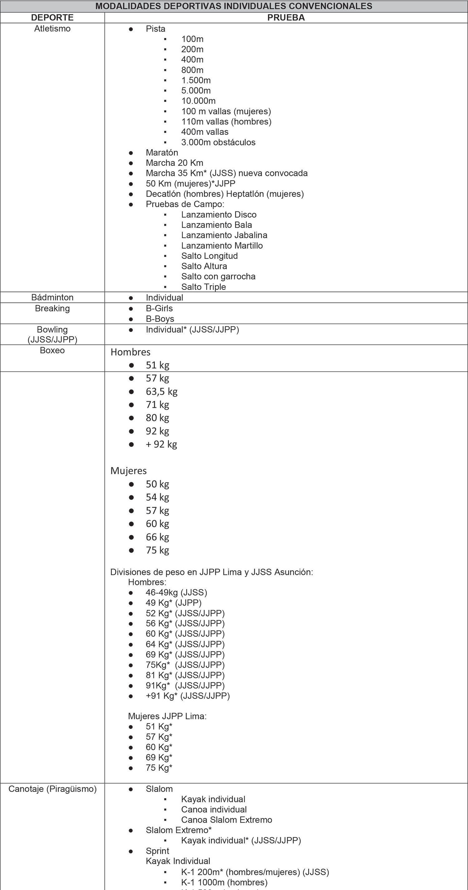 * Pruebas no convocadas en el programa de los Juegos Olímpicos, pero que se encuentran convocadas en el programa de Juegos Panamericanos y/o Juegos Suramericanos.