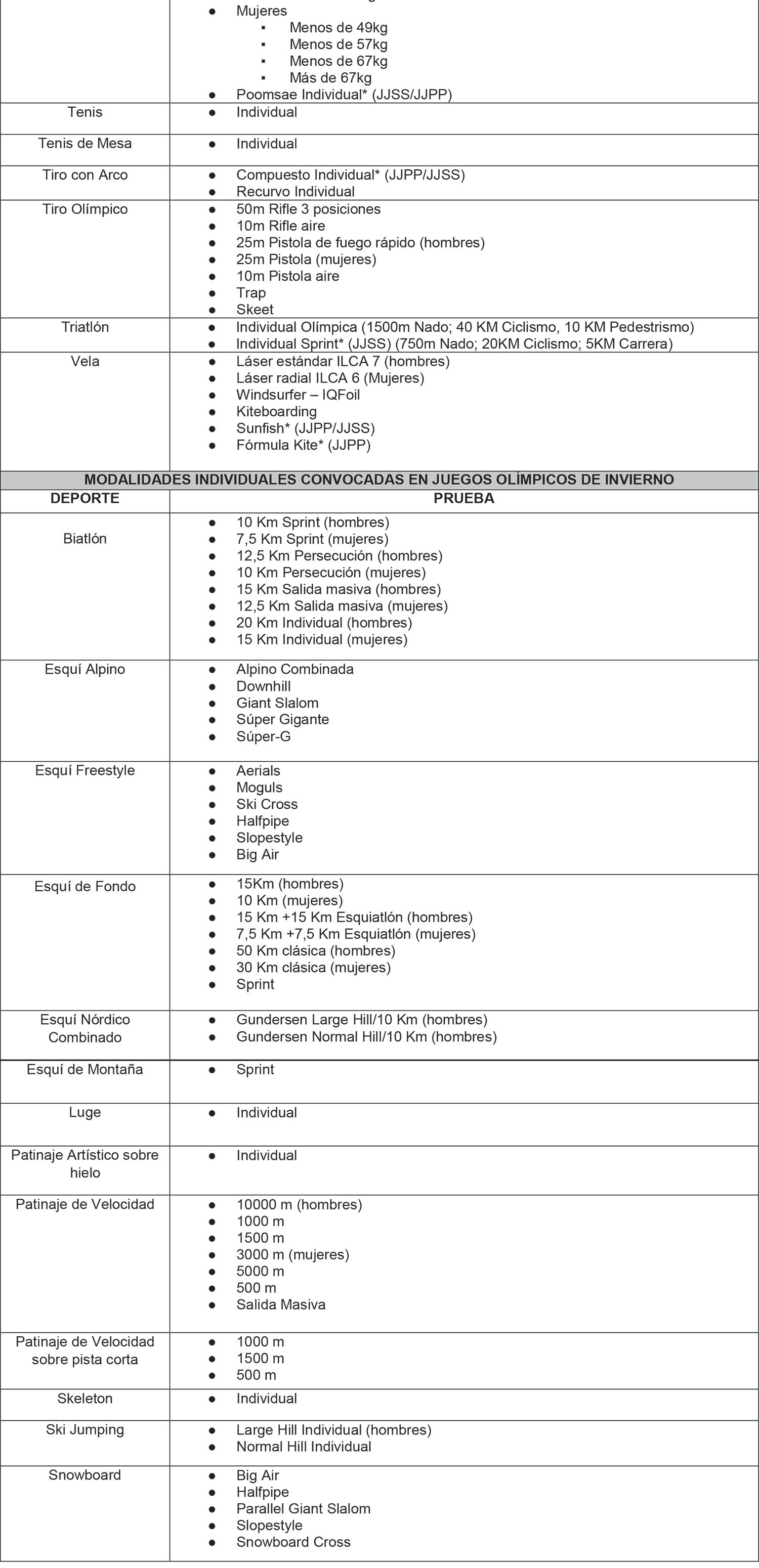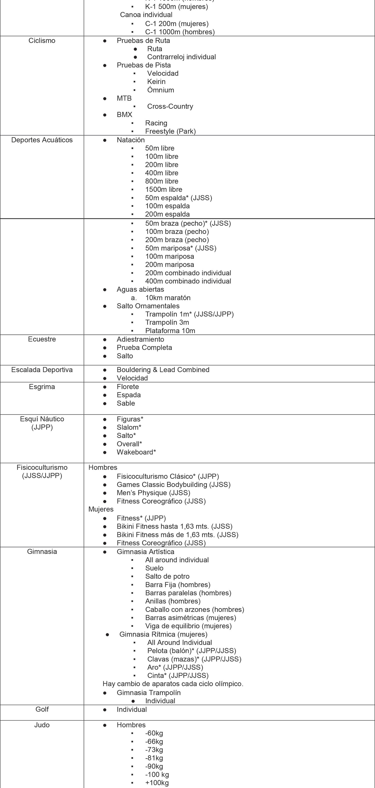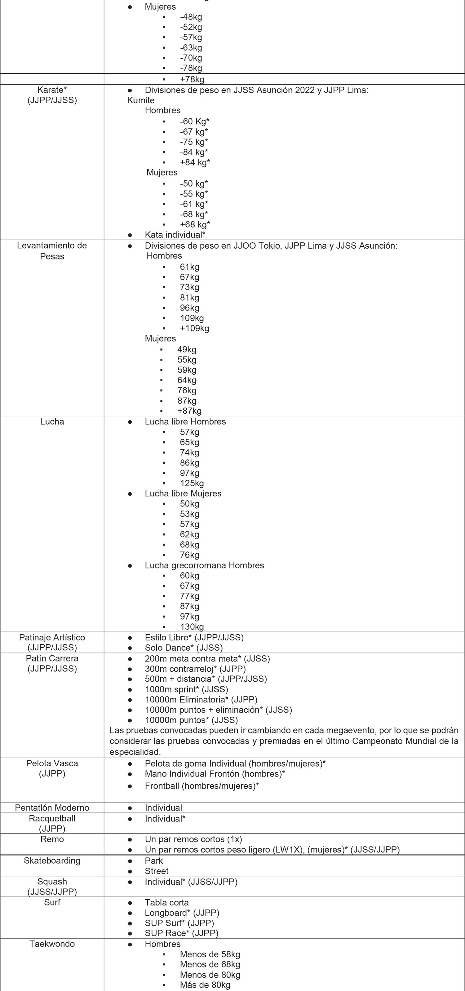 Los listados que se indican a continuación son meramente referenciales y consideran aquellas pruebas convocadas y premiadas en el programa de los Juegos Olímpicos y Paralímpicos, Juegos Panamericanos y Parapanamericanos, y Juegos Suramericanos y Parasuramericanos del Ciclo Olímpico y Paralímpico vigente, de verano e invierno. Se considerarán pruebas convocadas y premiadas a aquellas que forman parte del medallero general de los eventos señalados precedentemente en su última versión, o bien cuando se encuentren oficializadas en el programa de la próxima edición, por la entidad organizadora del megaevento correspondiente.