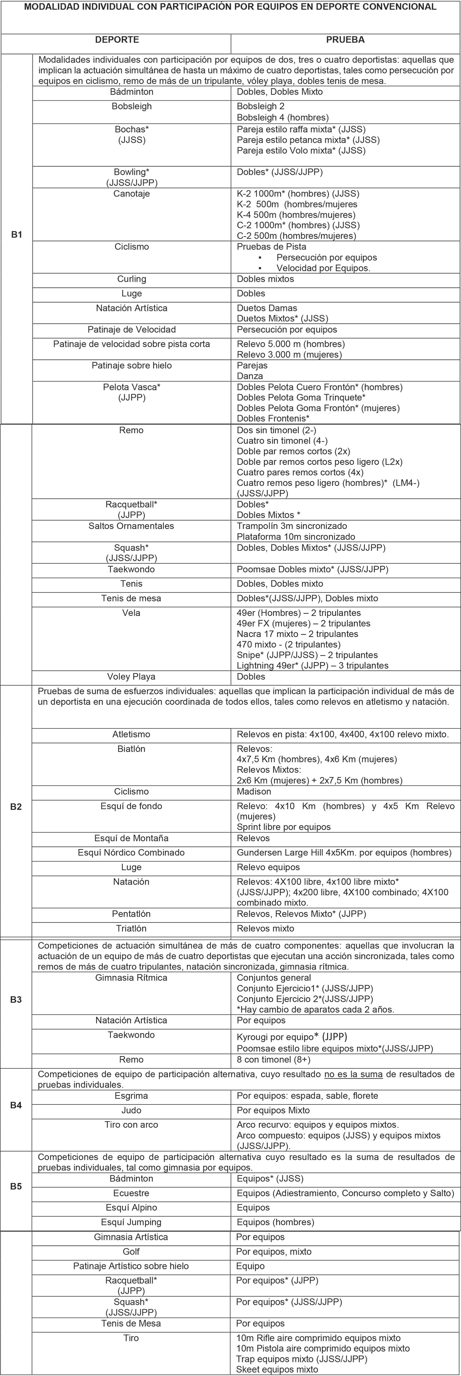 B) Listado de pruebas individuales con participación por equipos, de deporte convencional, en las cuales deberán establecerse los logros: