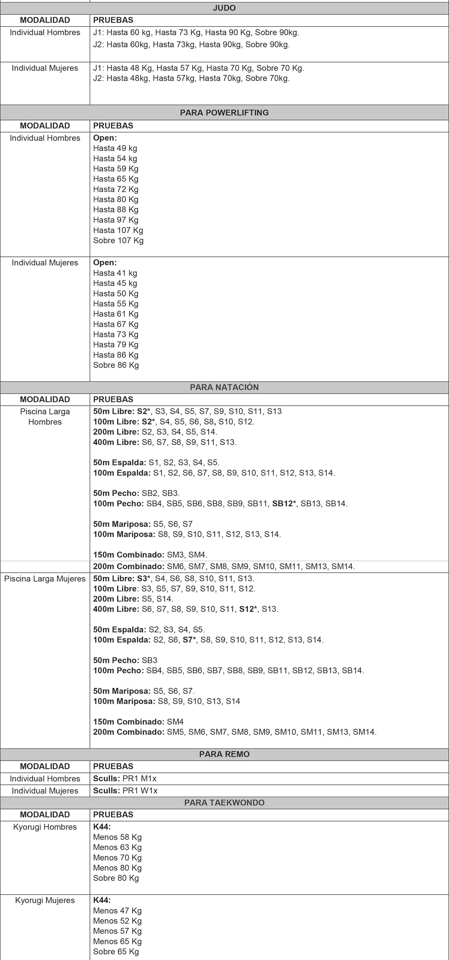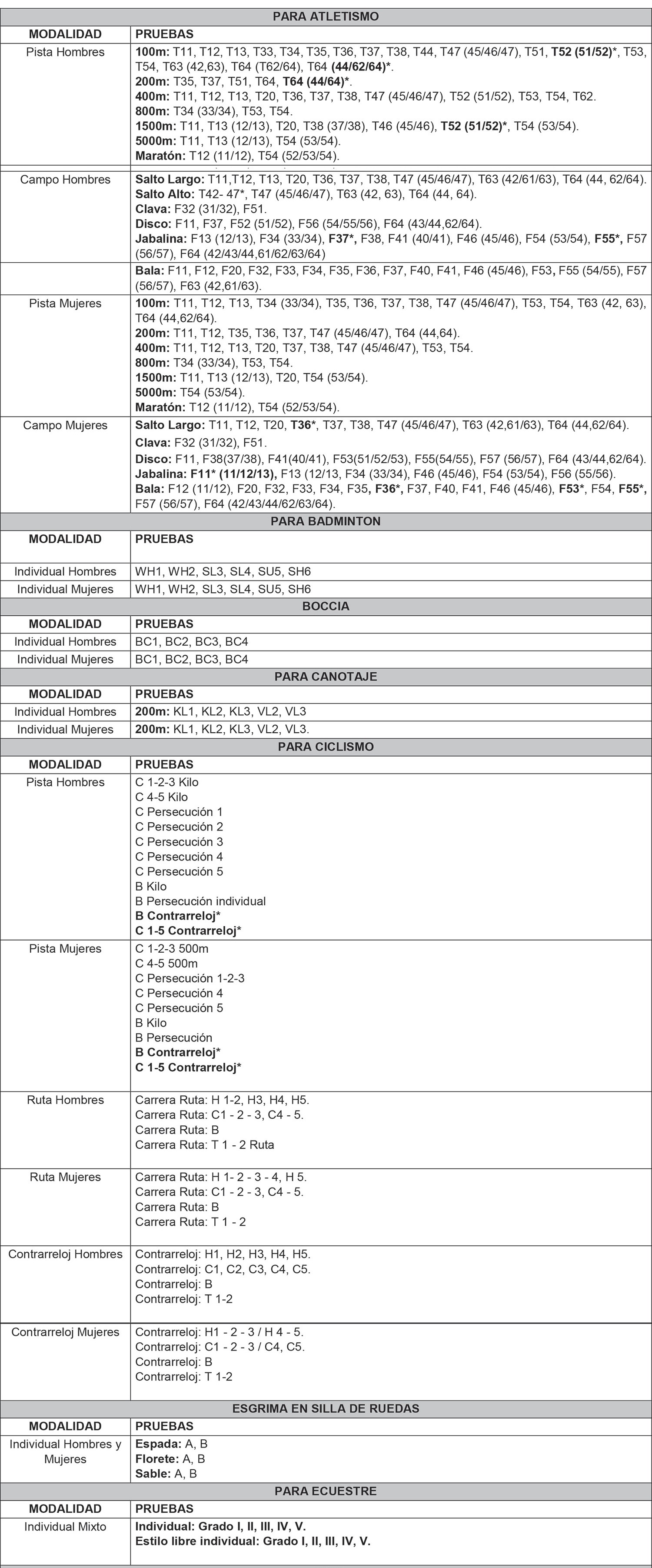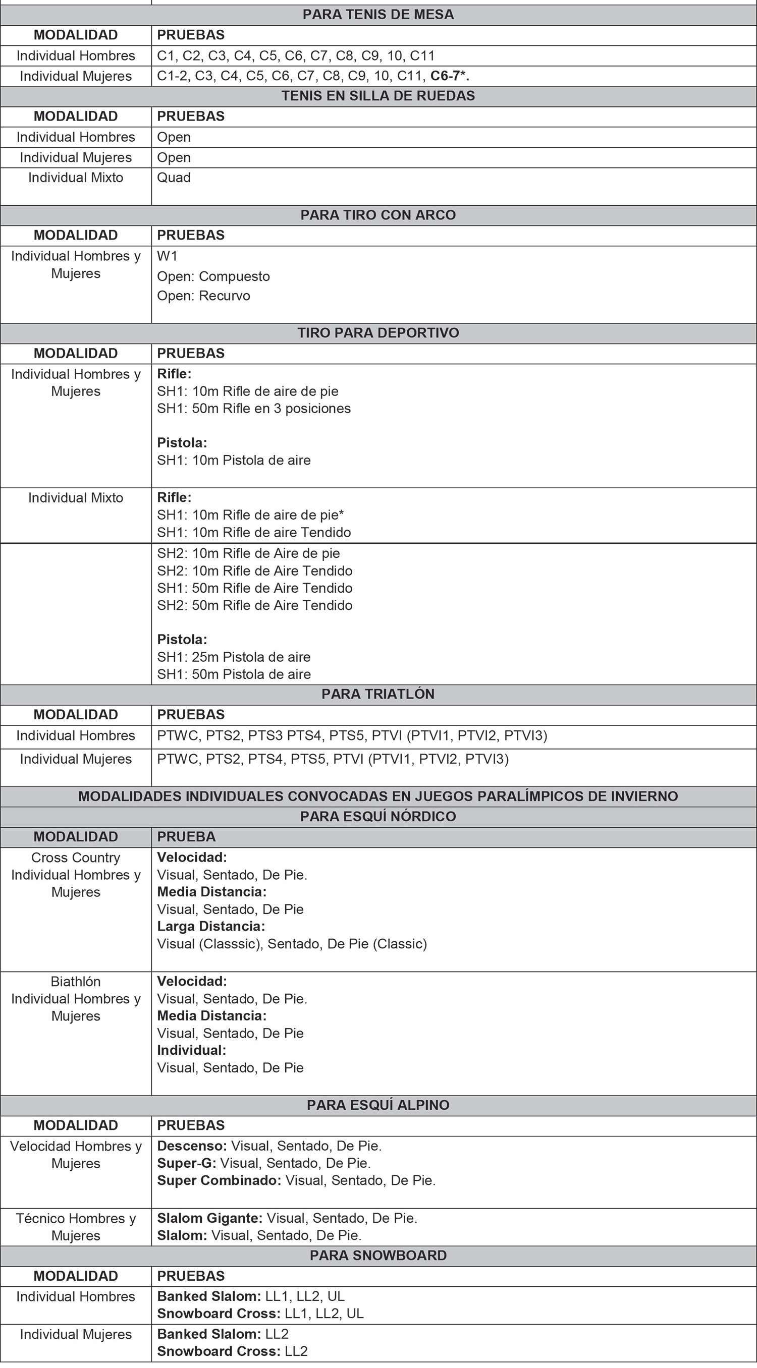 D) Listado de modalidades individuales, de deporte paralímpico, en las cuales podrán obtenerse logros deportivos: (* Prueba convocada sólo en Juegos Para Panamericanos o Para Suramericanos)
