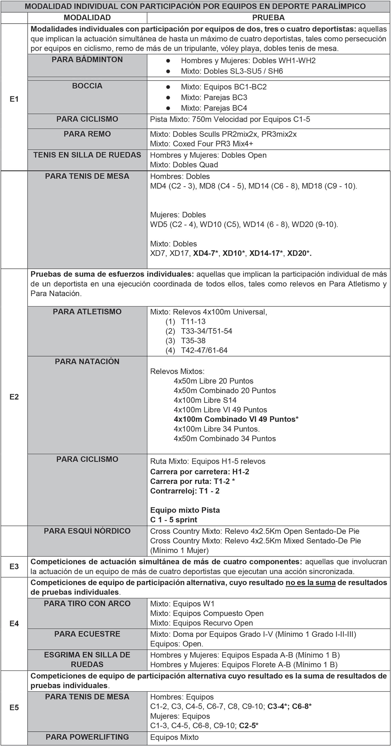 E) Listado de modalidades individuales con participación por equipos, de deporte paralímpico, en las cuales deberán establecerse los logros: (* Prueba convocada sólo en Juegos Para Panamericanos o Para Suramericanos)