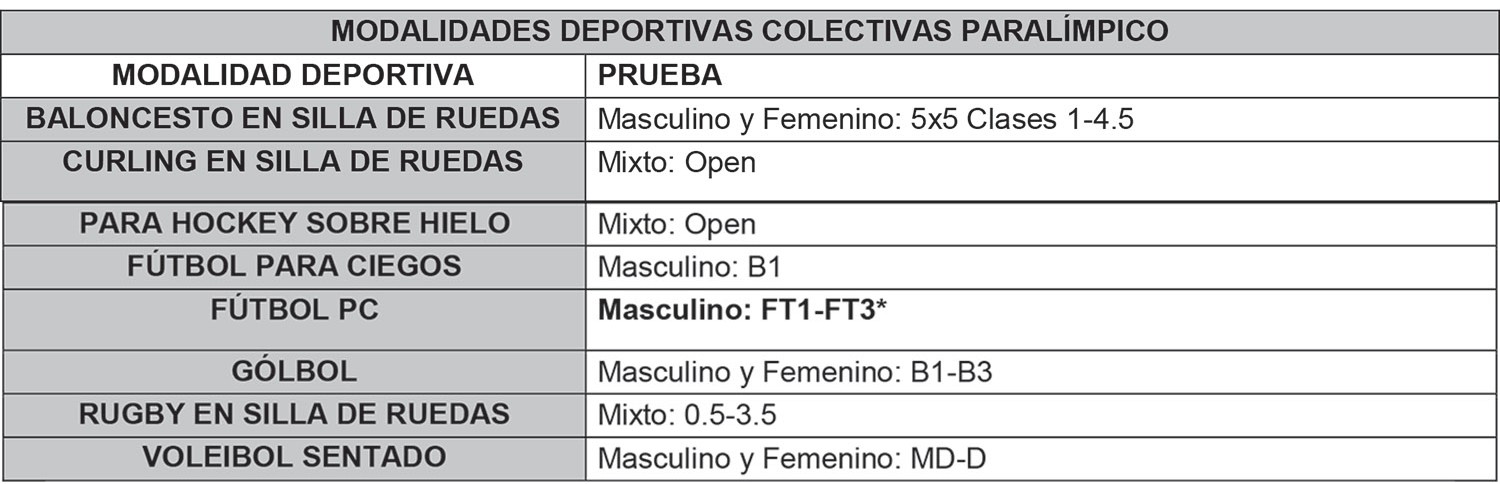 F) Listado de modalidades colectivas, de deporte paralímpico, en las cuales podrán obtenerse logros deportivos: (* Prueba convocada sólo en Juegos Para Panamericanos o Para Suramericanos)