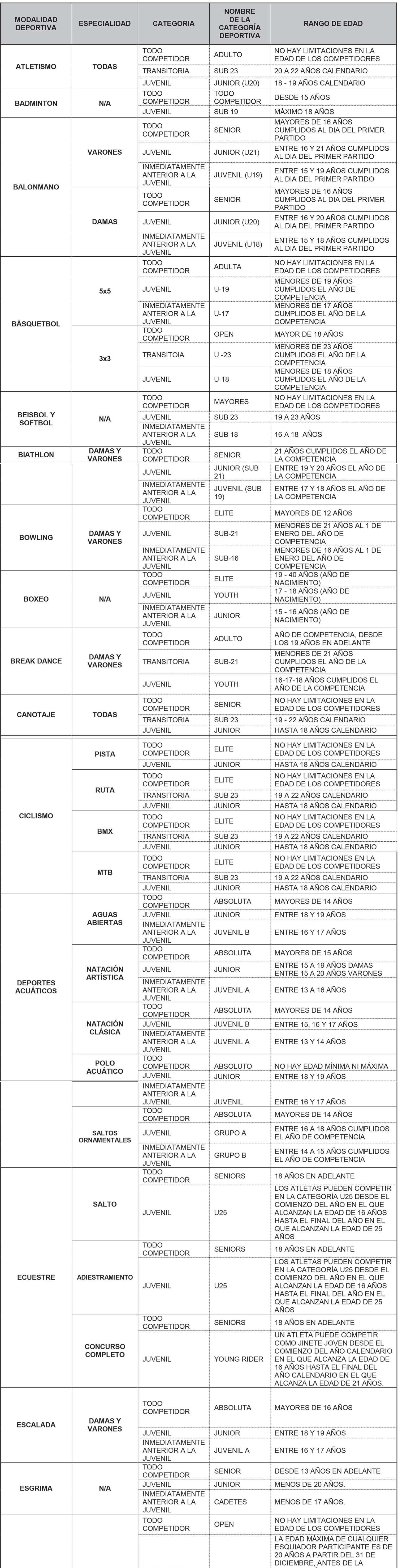 Las categorías deportivas se encuentran detalladas por modalidad deportiva en el Anexo III y Anexo IV de la presente resolución Complementaria.