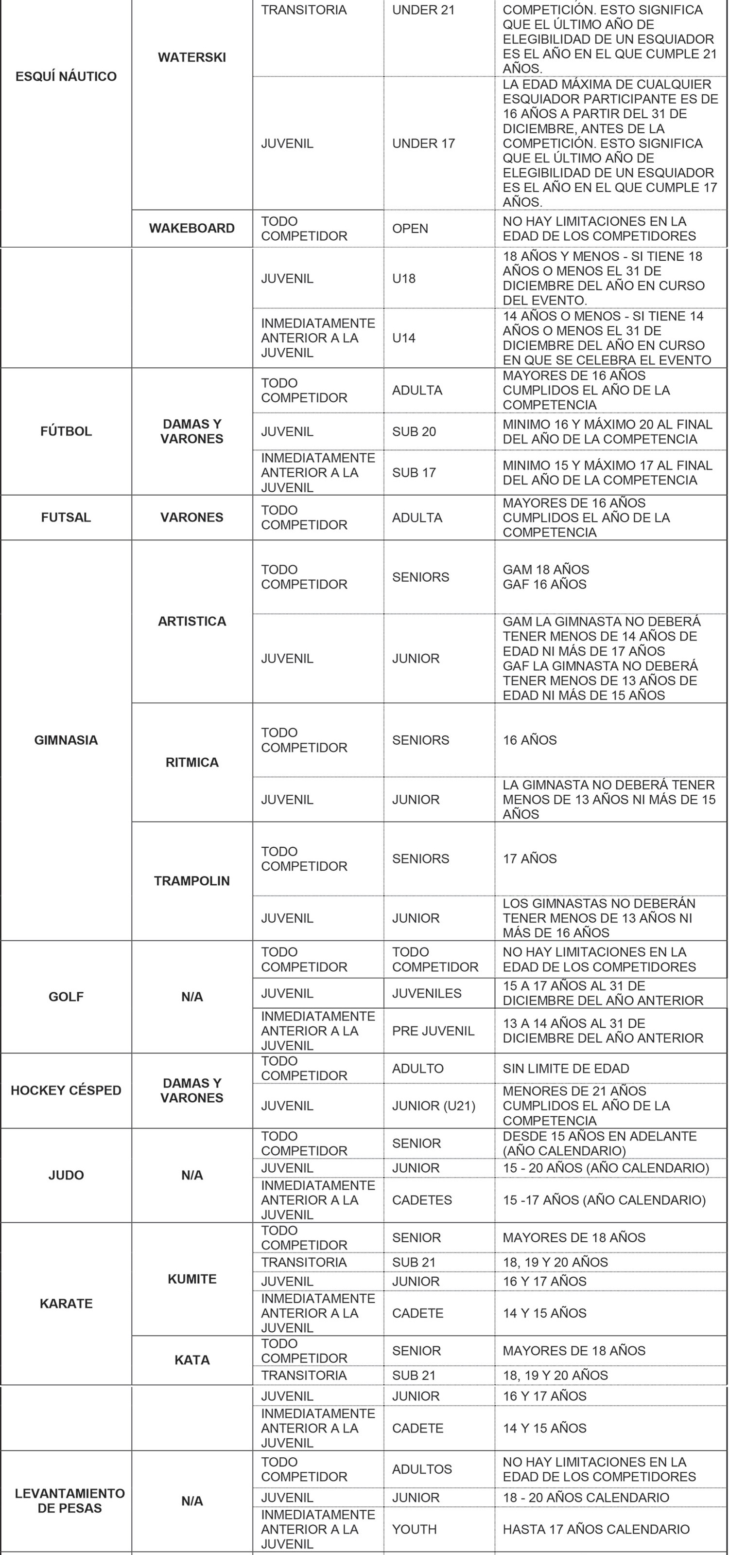 b. Categoría Juvenil, para los efectos de la presente resolución Complementaria, corresponde a aquellas categorías de competición de deporte convencional o paralímpico que autoriza la participación de deportistas con límite de edad máxima inmediatamente inferior a la edad adulta, o una edad superior a ésta, si excepcionalmente así se encuentra establecido en las reglamentaciones oficiales específicas dispuestas por la respectiva modalidad deportiva tales como categoría Junior en Ciclismo, categoría Juvenil B en Natación, categoría Junior en Canotaje, categoría Junior (U20) en Atletismo, categoría Under 17 en Esquí Náutico, categoría U21 en Para Canotaje, categoría U20 en Para Powerlifting, categoría U21 en Para Tenis de Mesa, entre otras.