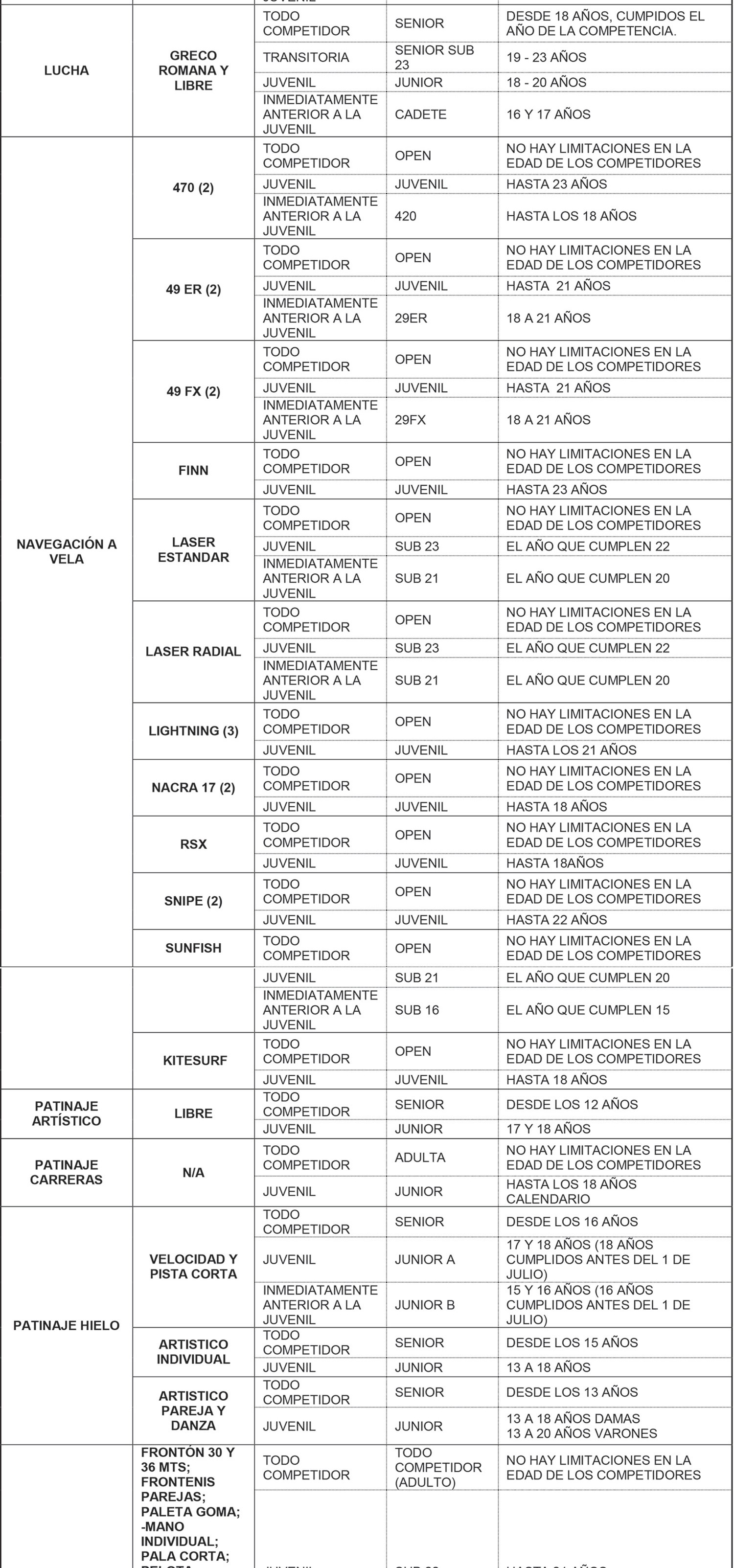 Los logros conducentes a los premios por la obtención de logros deportivos para las modalidades deportivas no integradas al ciclo olímpico y paralímpico vigente deben ser obtenidos en categoría Absoluta o Todo Competidor. Esta categoría por modalidad deportiva, corresponden a las siguientes: