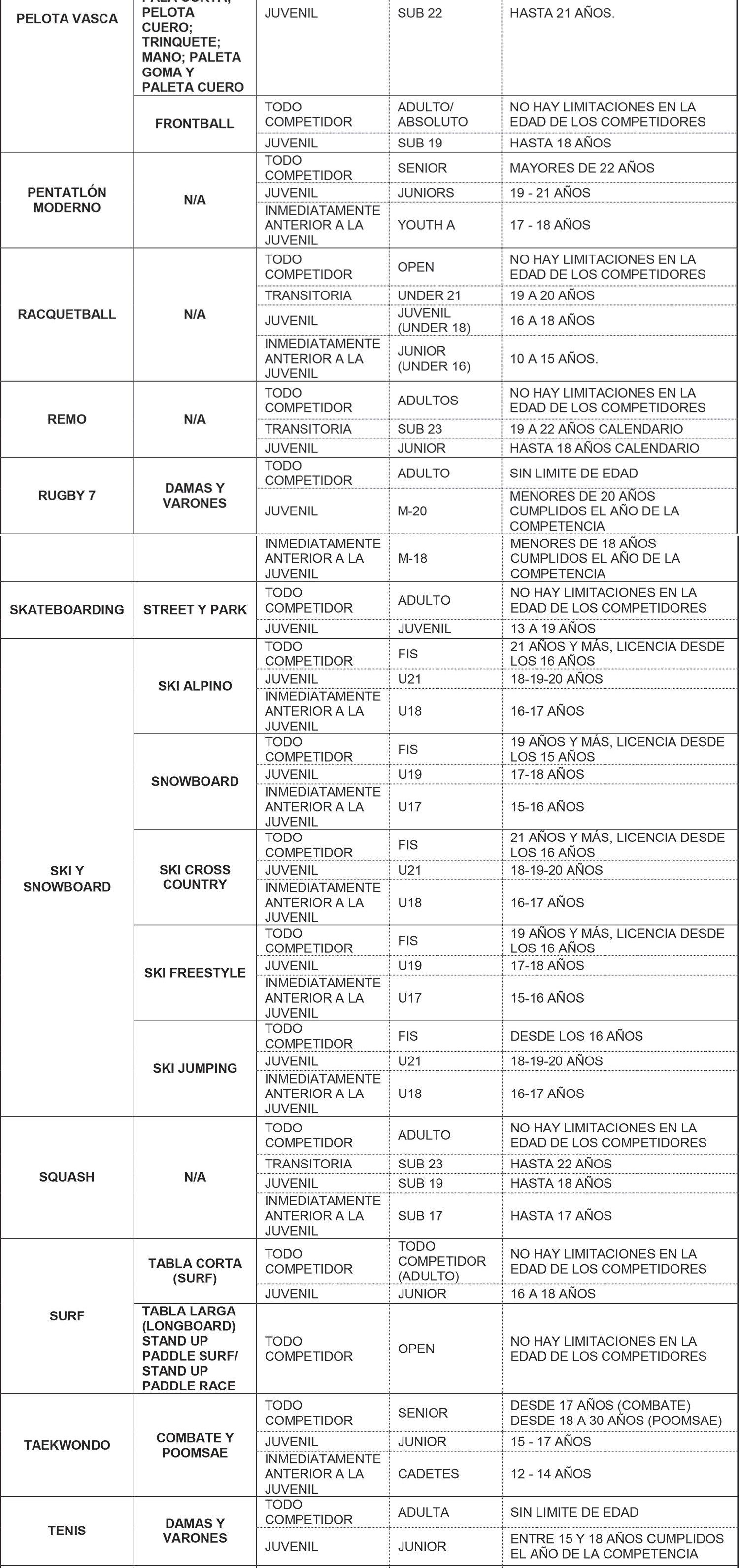 ANEXO III: LISTADO DE CATEGORÍAS ABSOLUTA O TODO COMPETIDOR, Y CATEGORÍA JUVENIL POR MODALIDAD DEPORTIVA EN DEPORTE CONVENCIONAL.