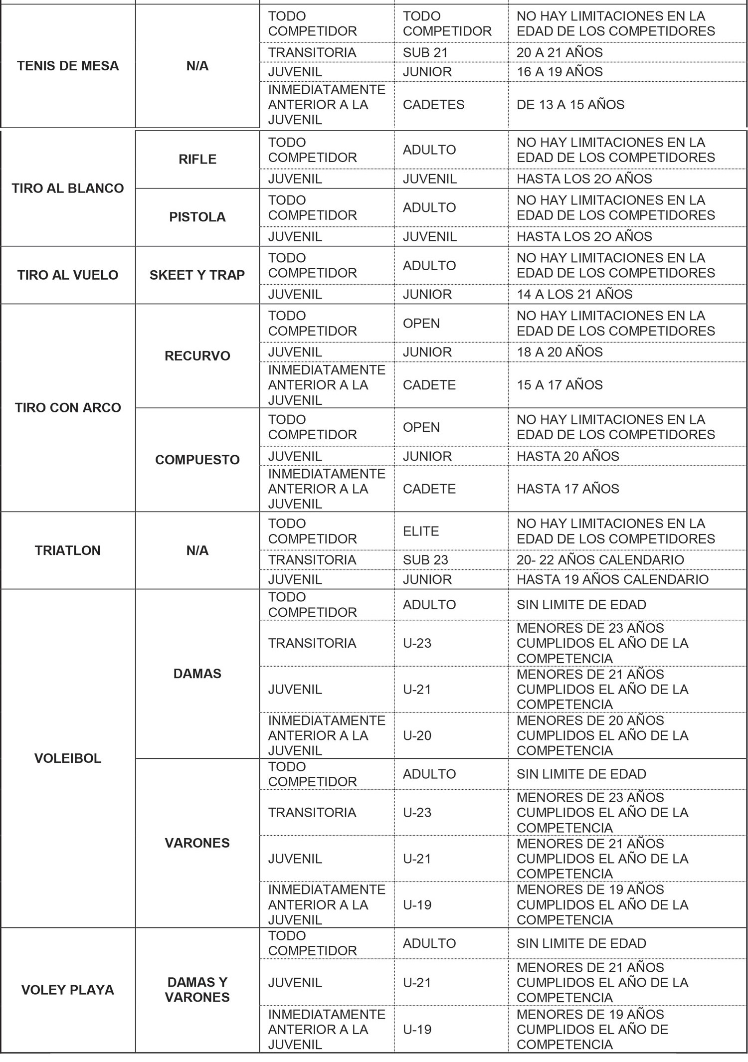 ANEXO II: DESCRIPCIÓN DE CLASES FUNCIONALES EN DEPORTE PARALÍMPICO. ANEXO III: LISTADO DE CATEGORÍAS ABSOLUTA O TODO COMPETIDOR, JUVENIL Y TRANSITORIA POR MODALIDAD EN DEPORTE OLÍMPICO.