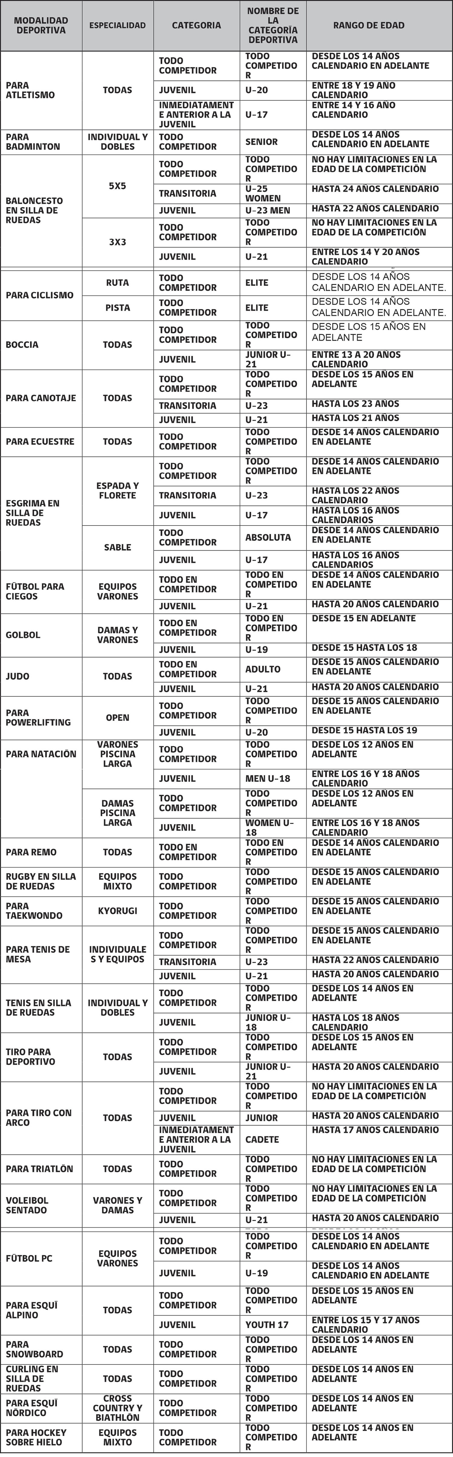 ANEXO IV: LISTADO DE CATEGORÍAS ABSOLUTA O TODO COMPETIDOR, Y CATEGORÍA JUVENIL POR MODALIDAD DEPORTIVA EN DEPORTE PARALÍMPICO.