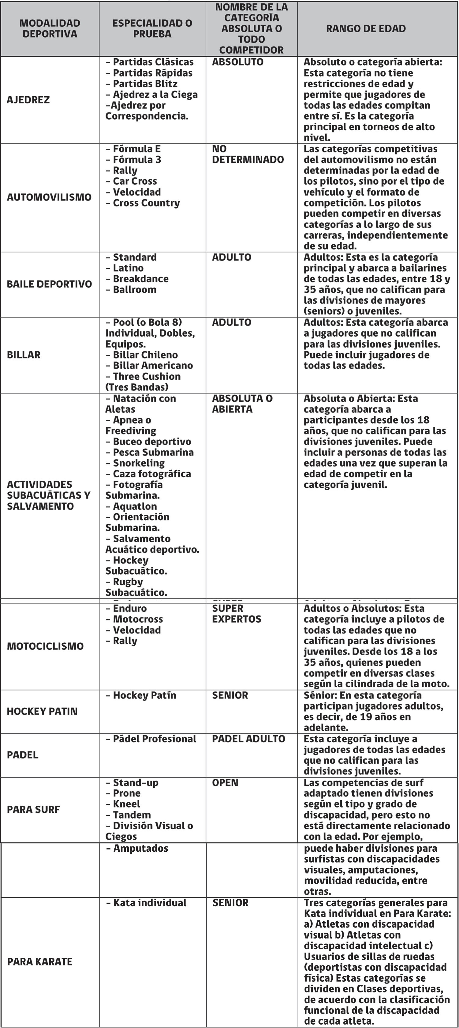 a. Categoría Todo Competidor o Absoluta, para los efectos de la presente resolución Complementaria, corresponde a aquella categoría de competición de deporte convencional o paralímpico del más alto estándar de rendimiento, que autoriza la participación de deportistas sin requisitos de límite de edad máxima, conforme a las reglamentaciones oficiales específicas dispuestas por las respectivas modalidades deportivas y entidades organizadoras de eventos deportivos tales como categoría Elite en Ciclismo, categoría Absoluta en Natación, categoría Senior en Canotaje, categoría Adulto en Atletismo, categoría Open en Esquí Náutico, entre otras.