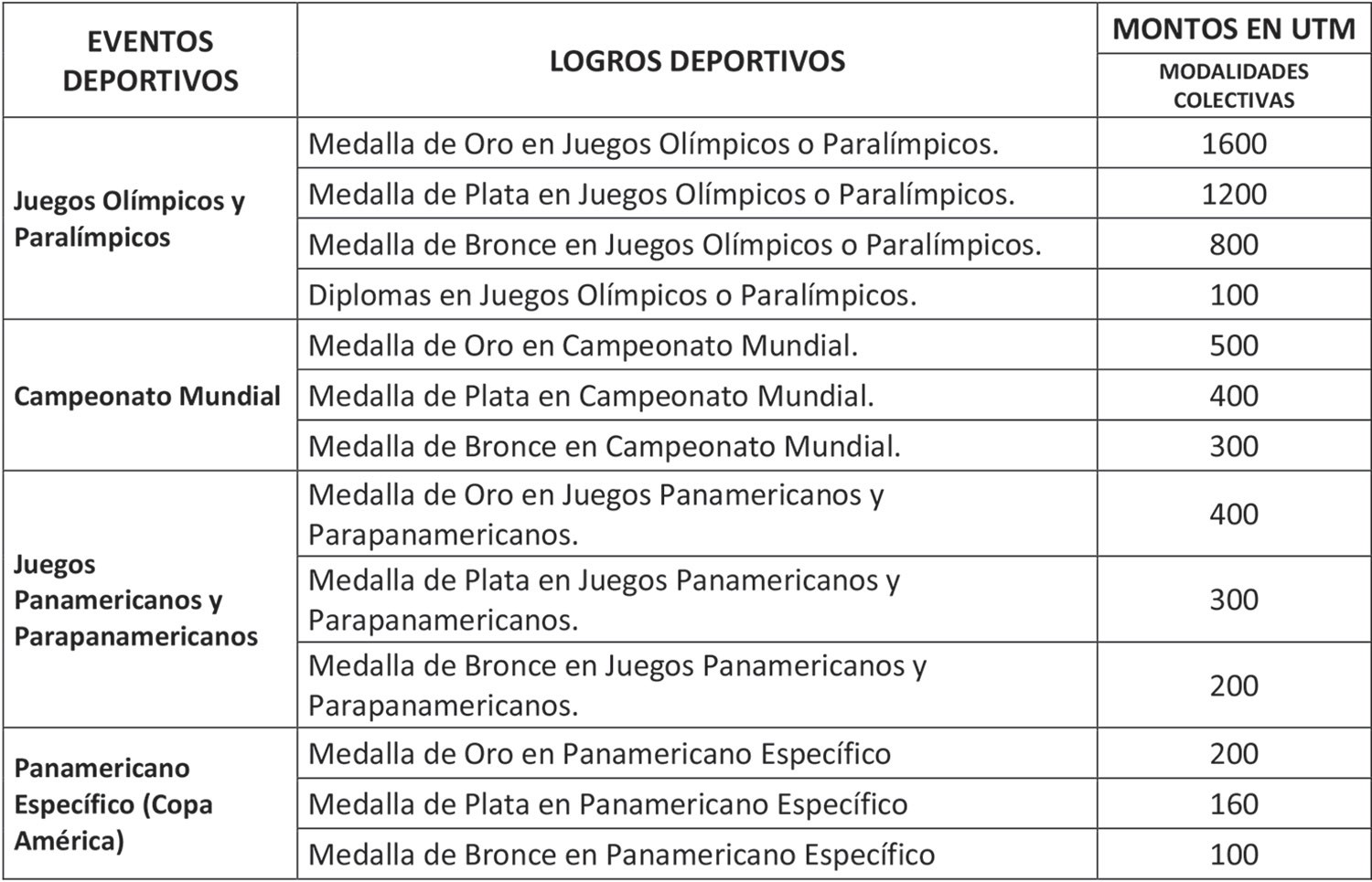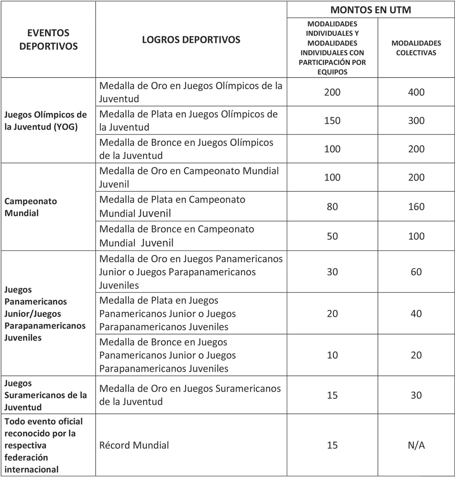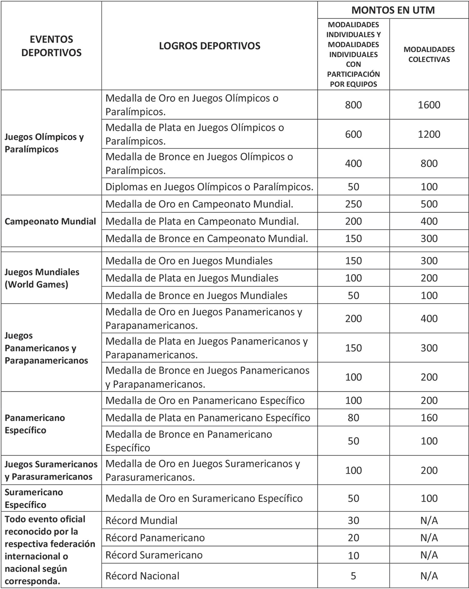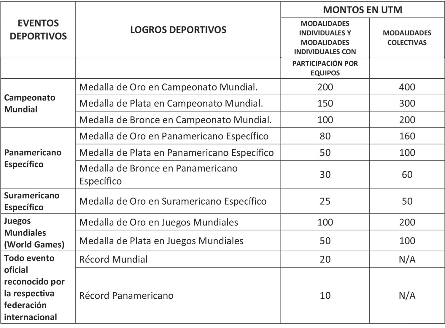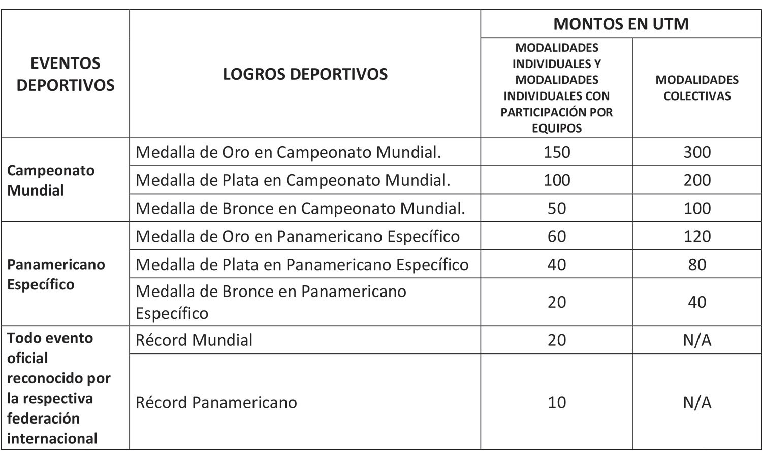 El artículo primero letra a) de la Resolución 72 Exenta, Deporte, publicada el 16.02.2024, modifica la tabla inserta en el presente artículo en el sentido de incrementar los montos en UTM asignados como premios a los Logros Deportivos "Medalla de Oro" y "Medalla de Plata", obtenidos en el Evento Deportivo "Panamericano Específico".