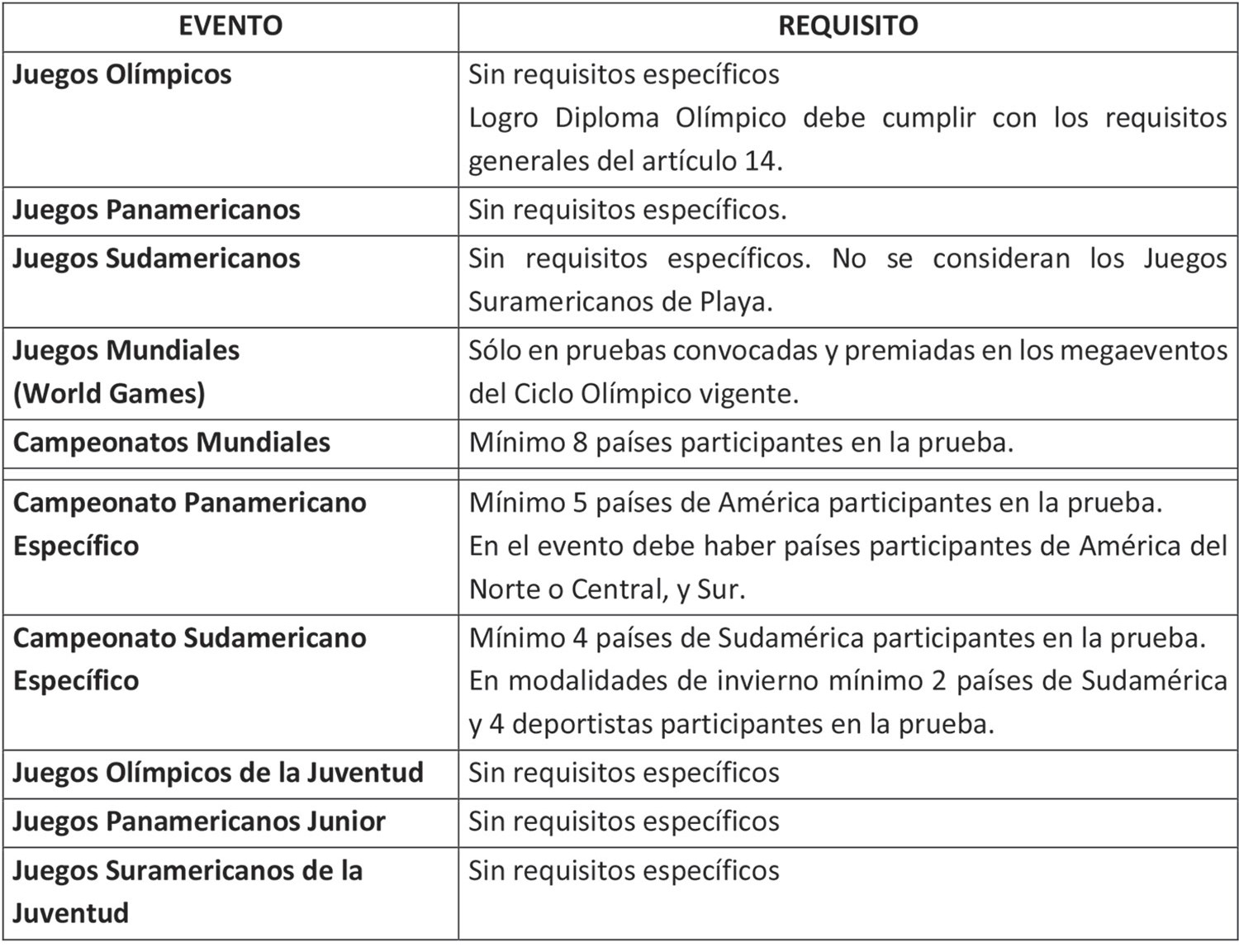 Artículo 15: Requisitos Específicos que deben cumplir los logros obtenidos en pruebas convocadas y premiadas en megaeventos del Ciclo Olímpico vigente.
