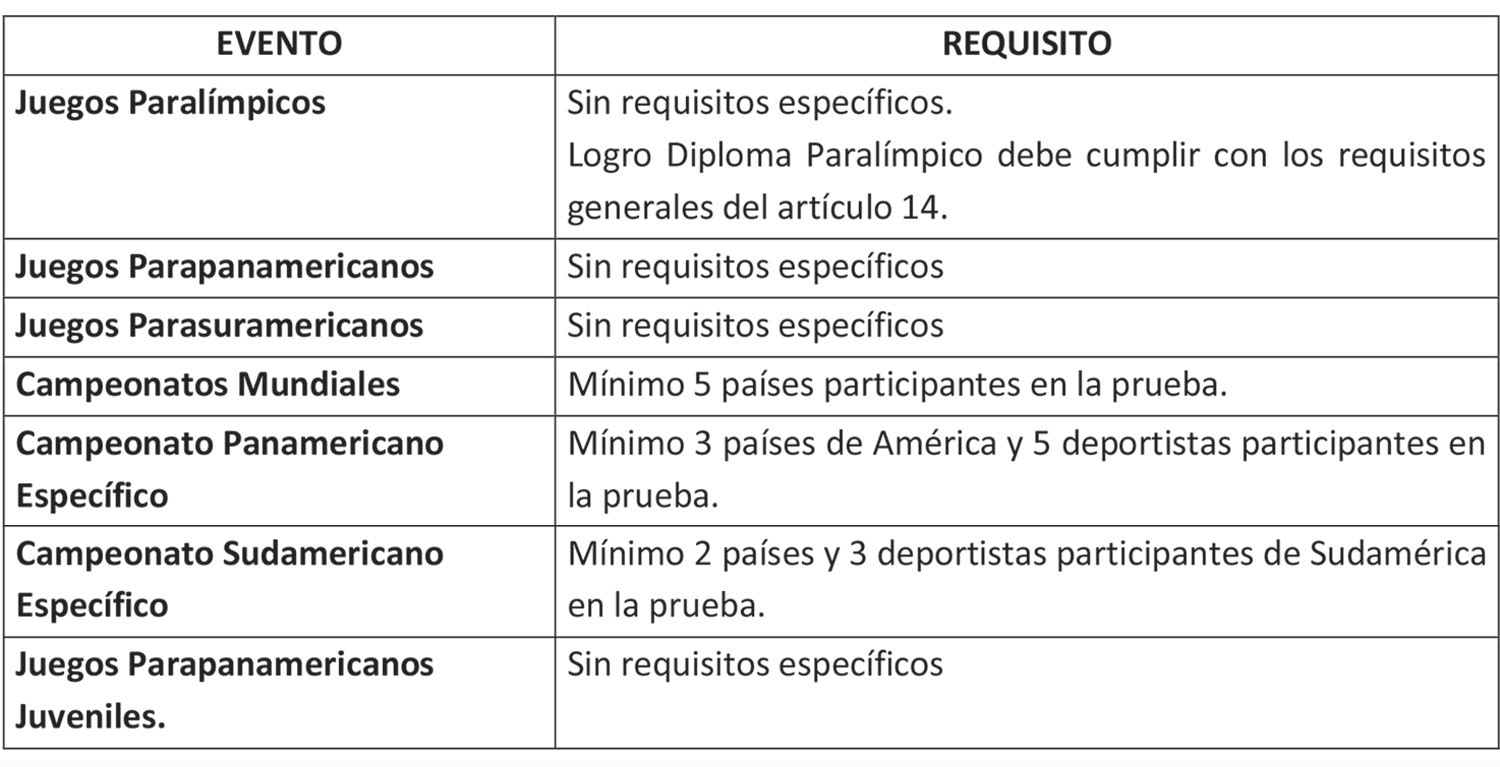 Artículo 16: Requisitos Específicos que deben cumplir los logros obtenidos en pruebas convocadas y premiadas en megaeventos del Ciclo Paralímpico vigente.