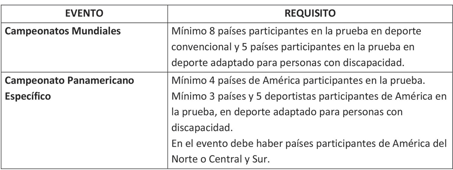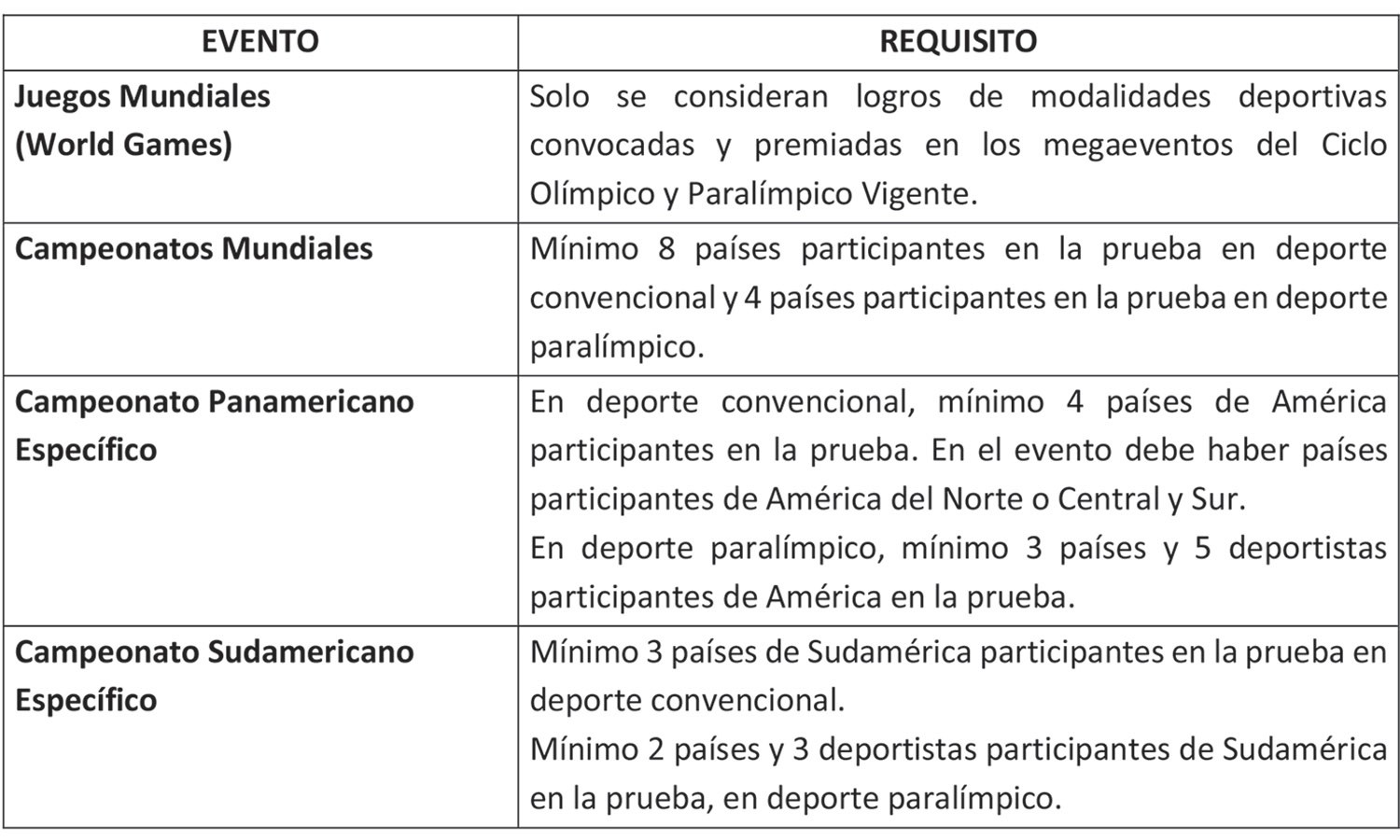 b. El logro deportivo deberá ser considerado con proyección deportiva, es decir, en la competencia (prueba) deben haber participado al menos tres países en deporte paralímpico, y al menos cuatro países en deporte olímpico.