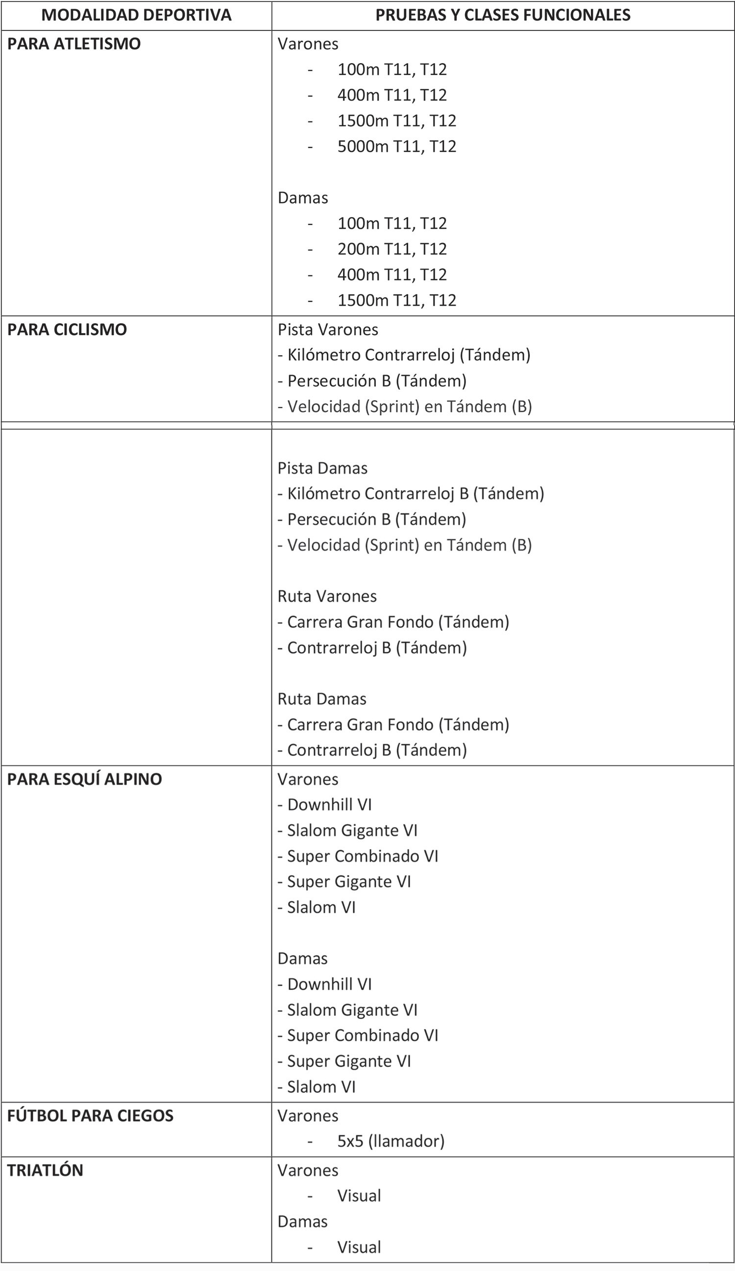 Sólo los logros obtenidos en las pruebas que se indican a continuación serán considerados para efecto de la entrega de los Premios por la Obtención de Logros Deportivos, a los guías paralímpicos:
