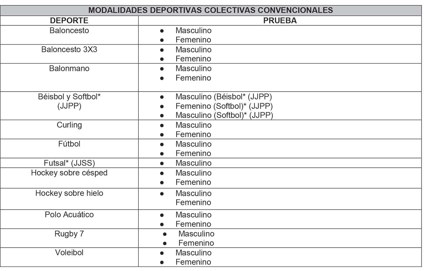 C) Listado de modalidades colectivas, de deporte convencional, en las cuales podrán obtenerse logros deportivos:
