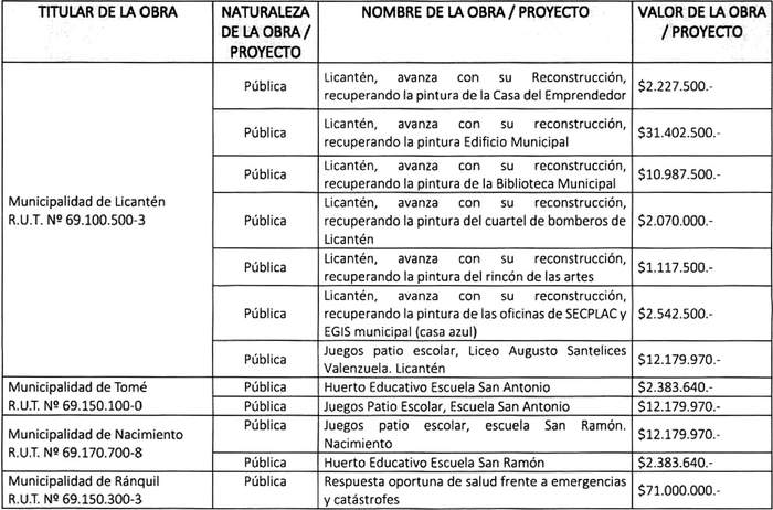 3. Que, habiendo dado cumplimiento a lo establecido en la ley Nº 20.444 y su Reglamento, los distintos intervinientes en el proceso de calificación de las postulaciones de obras específicas, han recomendado la inclusión de las siguientes obras o proyectos que se detallan a continuación las cuales pueden financiarse con donaciones susceptibles de acogerse a los beneficios tributarios establecidos en la ley Nº 20.444.