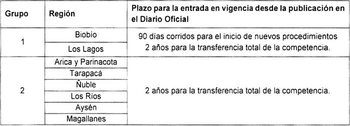 Artículo 3°. Establécese que la competencia antes prevista deberá ser ejercida por los Gobiernos Regionales de Arica y Parinacota, Tarapacá, Ñuble, Biobío, Los Ríos, Los Lagos, Aysén y Magallanes y la Antártica Chilena por un periodo de 10 años a contar de la entrada en vigencia de la transferencia, en conformidad con las fechas que se indican a continuación.