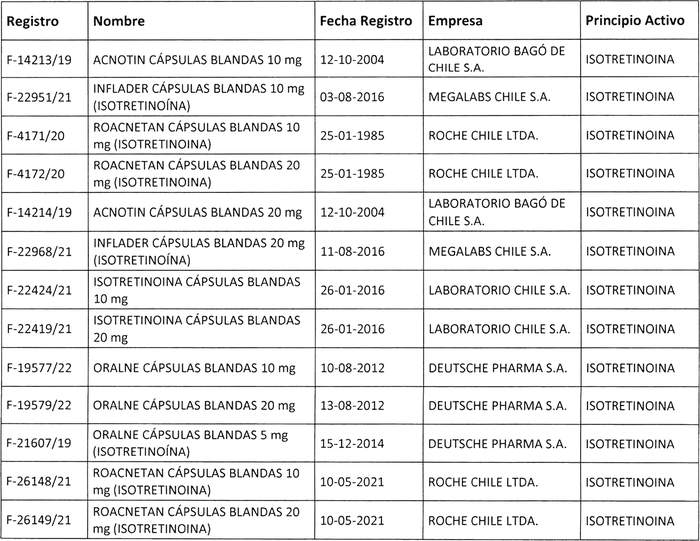 5. Los registros sanitarios vigentes que contienen el principio activo isotretinoína en su formulación, cuyos antecedentes técnicos se encuentran contenidos en la base de datos Gicona del Instituto de Salud Pública de Chile;