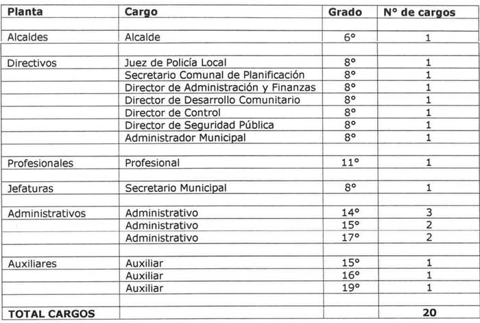 Artículo 1º: De conformidad a lo establecido en los artículos 49 bis, 49 quáter y 49 quinquies de la ley Nº 18.695, Orgánica Constitucional de Municipalidades; fíjese la Planta de Personal de la Municipalidad de Huara, como se indica: