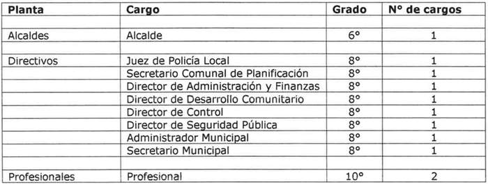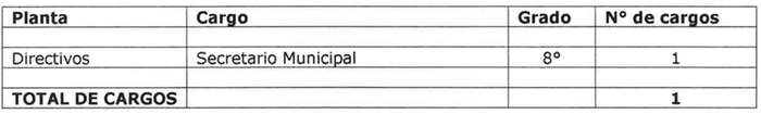 e) Traspásese el cargo de Secretario Municipal, desde el escalafón de Jefaturas al escalafón de Directivos, asignándosele el grado 8º, quedando fijado el cargo en la siguiente forma: