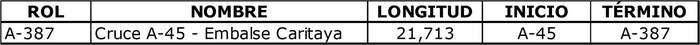 3) Que, el camino Rol A-387, Cruce A-45 - Embalse Caritaya, de acuerdo con la distribución político–administrativa del país tiene un tramo de aprox. 6,014 km en la Región de Tarapacá, y otro tramo continuo de 15.699 km en la Región de Arica y Parinacota, con una longitud total de 21.713 km.