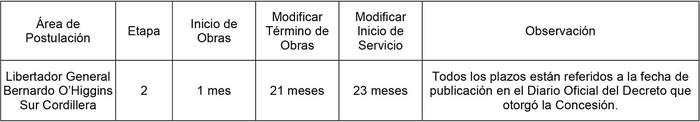 1. Autorízase a la concesionaria para modificar los plazos máximos de término de obras y de inicio de servicio establecidos en la concesión otorgada por decreto supremo Nº 190 de 2021, del Ministerio de Transportes y Telecomunicaciones, de conformidad al pronunciamiento emitido por la Subsecretaría de Telecomunicaciones y que consta en los oficios Ord. del literal o) de los Vistos, según se indica a continuación: