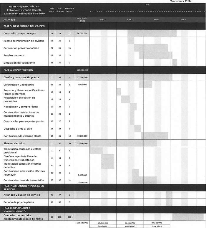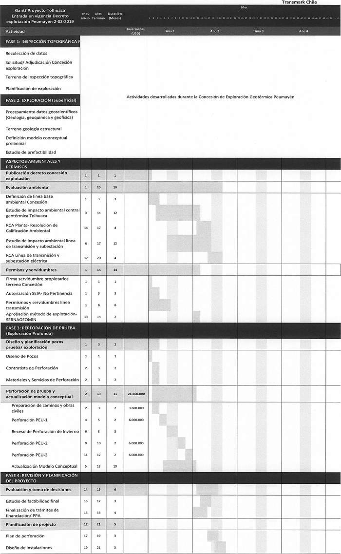 4º Los antecedentes técnicos del proyecto geotérmico Tolhuaca, presentado por la empresa Transmark Chile SpA están contenidos en la misma solicitud, mediante presentación de fecha 30 de diciembre de 2022, los cuales incluyen la identificación del solicitante, la identificación del proyecto y el terreno solicitado, los antecedentes técnicos y económicos del proyecto y el detalle de las actividades de explotación geotérmica, todos los cuales quedan archivados en el Ministerio de Energía. La carta Gantt del proyecto de explotación se indica a continuación:
