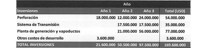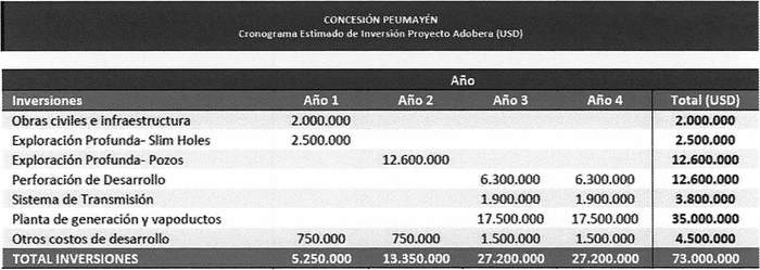 8º Los antecedentes económicos del proyecto geotérmico Adobera, presentado por la empresa Transmark Chile SpA, se encuentran explicitados en el cronograma de inversiones proyectadas para el mismo proyecto, el cual da cuenta de una inversión total que asciende a US$ 73.000.000 (setenta y tres millones de dólares de los Estados Unidos de Norteamérica), considerando el desglose que se presenta a continuación: