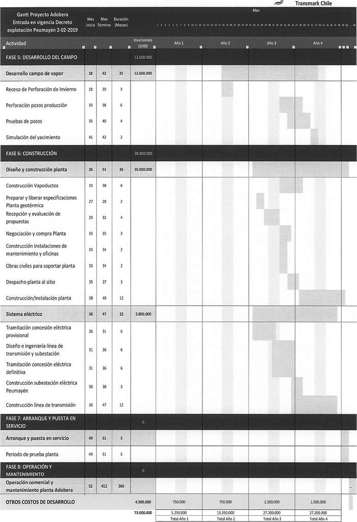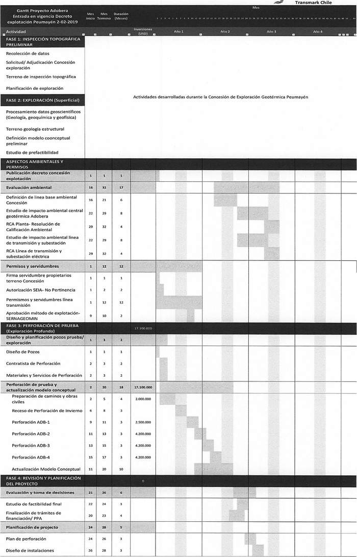 7º Los antecedentes técnicos del proyecto geotérmico Adobera, presentado por la empresa Transmark Chile SpA, están contenidos en la presentación realizada con fecha 30 de diciembre de 2022, complementada mediante correo electrónico de fecha 18 de enero de 2023, los cuales incluyen la identificación del solicitante, la identificación del proyecto y el terreno solicitado, los antecedentes técnicos y económicos del proyecto y el detalle de las actividades de explotación geotérmica, quedan archivados en el Ministerio de Energía. La carta Gantt del proyecto de explotación se indica a continuación: