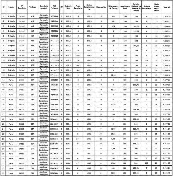APRUEBA NÓMINA DE 33 POSTULANTES SELECCIONADOS, DE LAS COMUNAS DE PURÉN Y TRAIGUÉN, PARA El OTORGAMIENTO DE SUBSIDIOS HABITACIONALES DEL TÍTULO II, EN LA MODALIDAD DE CONSTRUCCIÓN DE VIVIENDA NUEVA, CON PROYECTO DESARROLLADO, DEL PROGRAMA DE HABITABILIDAD RURAL, REGULADO POR EL DS N° 10 (V. Y U.), DE 2015, DEL PROCESO DE SELECCIÓN DEL LLAMADO ESPECIAL DE LA RESOLUCIÓN N° 850 EXENTA (V. Y U.), DE 2023, PARA FAMILIAS DAMNIFICADAS POR EMERGENCIAS, EN LA ALTERNATIVA DE POSTULACIÓN INDIVIDUAL O COLECTIVA, EN LA REGIÓN DE LA ARAUCANÍA