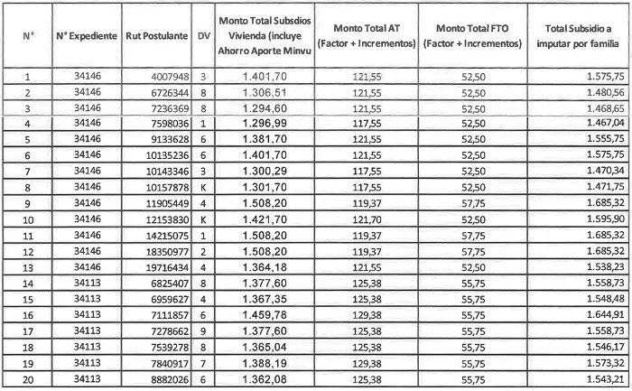 2. Los montos de Subsidios asignados a cada una de las personas seleccionadas mediante la presente resolución se detallan en la tabla adjunta, cuyo monto total de asignación corresponde a 52.864,68 Unidades de Fomento, incluido AT y FTO, que se imputarán a los recursos regionales del Programa de Habitabilidad Rural, DS N° 10 (V. y U.), de 2015, en la Región de La Araucanía, para el año 2023.