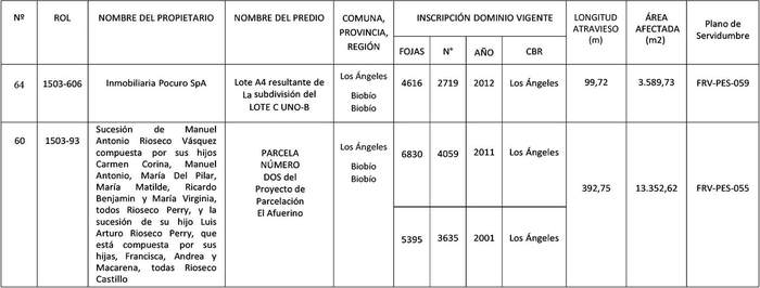 Artículo 7°.- Constitúyanse, de acuerdo con lo que sobre el particular establece la Ley General de Servicios Eléctricos, las servidumbres para el establecimiento de la línea de transmisión en los predios particulares que se indican a continuación: