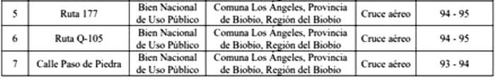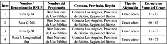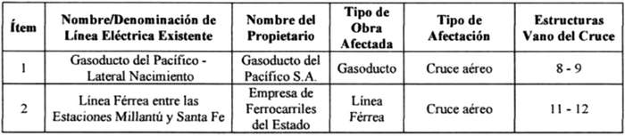 En su recorrido, el proyecto "Línea de transmisión 1x220 kV Rarinco - Los Varones" afectará las líneas eléctricas, obras e instalaciones existentes que se indican a continuación: