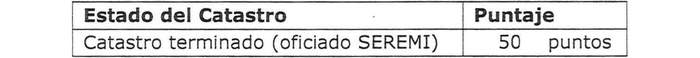 a) Puntaje para comunas del Catastro Nacional de Equipamiento Comunitario y Obras Menores del Minvu. Al puntaje obtenido en la ponderación Nacional y Regional se le sumará un puntaje adicional de acuerdo con el estado de avance que presenten las comunas en la implementación del catastro, de acuerdo con el siguiente criterio: