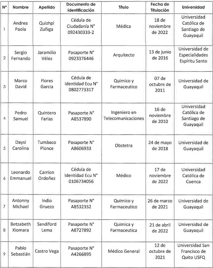 Artículo primero: Reconózcase, en el marco del "Convenio de Reconocimiento Mutuo de Títulos Profesionales y Grados Académicos de Educación Superior entre la República de Chile y la República del Ecuador", suscrito el 15 de octubre de 2015, los títulos de grado obtenidos en las universidades ecuatorianas que se indican a continuación: