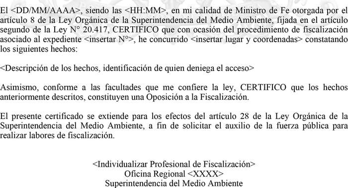 ...................................., cédula nacional de identidad N° .....................................cargo................., en representación de..................., rol único tributario Nº......................., por medio del presente acto autorizo a la Superintendencia del Medio Ambiente a realizar la entrega del acta de inspección ambiental a más tardar al día hábil siguiente al término de la inspección. Asimismo, autorizo que se efectúen las notificaciones del acta de inspección ambiental, así como de los actos administrativos que se deriven de esta fiscalización, por medio de: