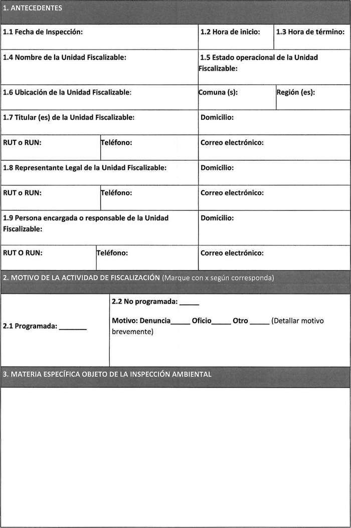 Apartado referido a los antecedentes de la unidad fiscalizable inspeccionada. Gran parte de esta información puede ser completada en forma previa al desarrollo de la actividad en terreno y verificada durante la visita.