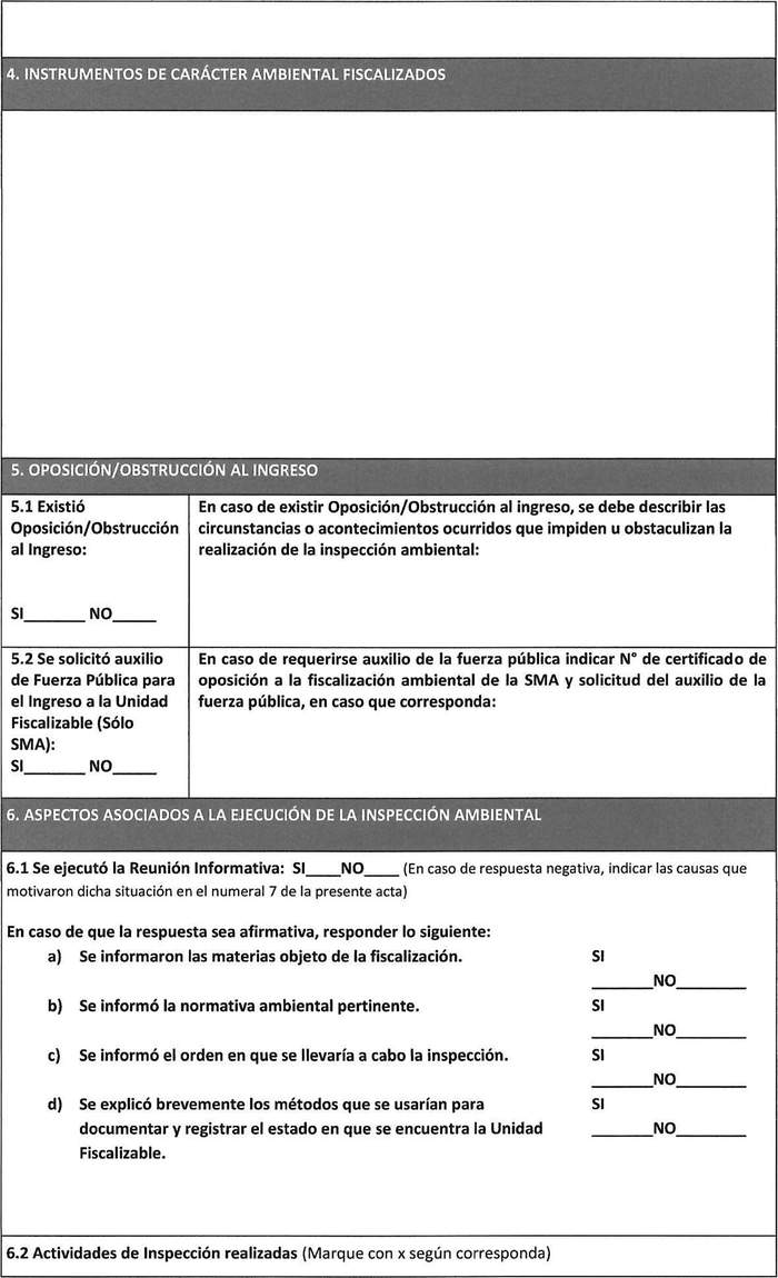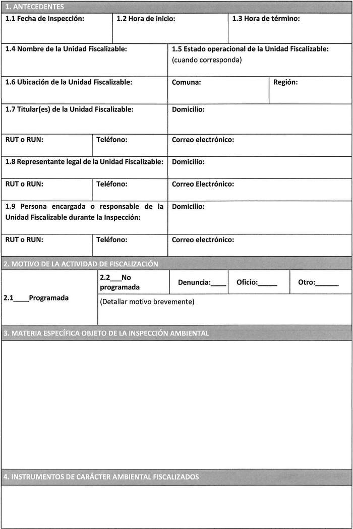 A continuación, se describe la información que debe ser plasmada en cada una de las secciones que componen el formato de acta de inspección ambiental utilizada por la SMA y por los OS que participan en las actividades de inspección ambiental.