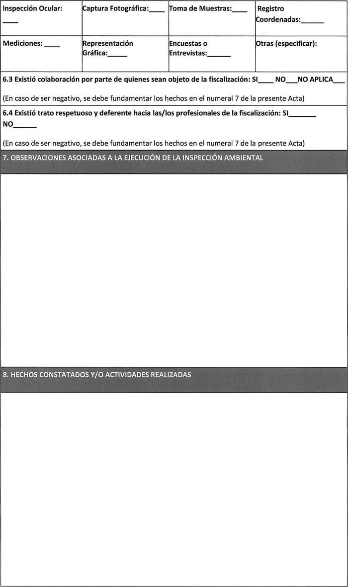 Si durante la actividad de inspección se efectuaron capturas fotográficas, registro de coordenadas o actividades de medición, no es necesario incluir todos los resultados en el acta de inspección, debiendo hacerse referencia a la realización de dichas actividades, indicando que los resultados se registraron en los medios correspondientes. Para el caso en que se realicen mediciones de otro tipo (ruido, lumínica, etc.) se debe indicar que se realizan las mediciones de acuerdo al procedimiento o instructivo correspondiente (en los casos que aplique), no siendo necesario incluir los resultados finales, ya que estos serán parte del análisis posterior, a incluir en el informe técnico de fiscalización ambiental.