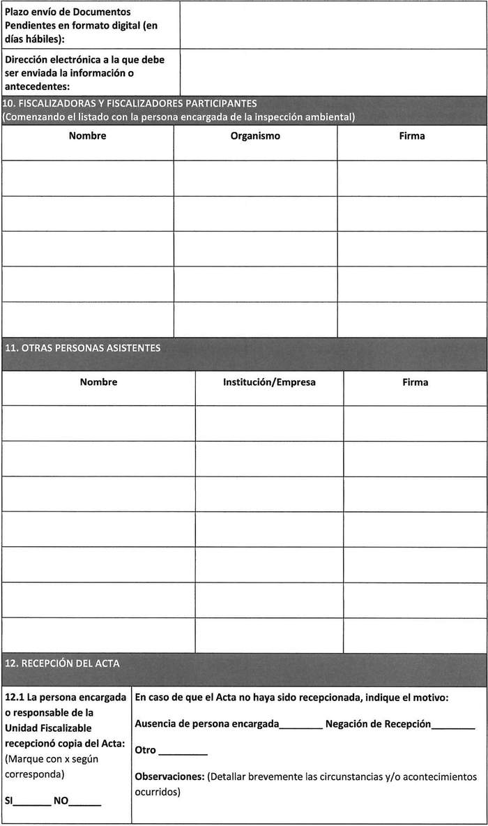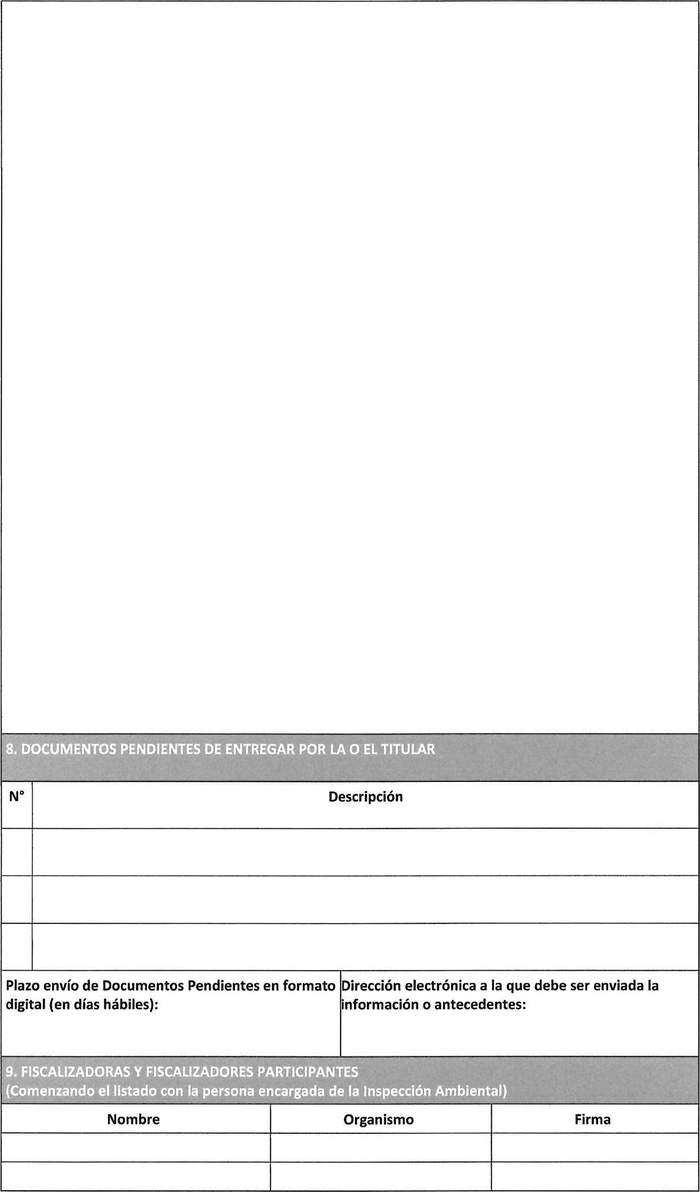 En esta sección se registran los documentos pendientes. En dicho caso, la persona encargada de la inspección ambiental deberá individualizar los mismos en el acta, otorgando un plazo razonable para proporcionar la información solicitada a la persona encargada o responsable de la unidad fiscalizable.