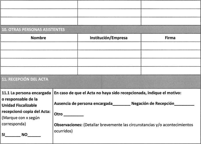 12.1 Recepción del acta por parte de la persona encargada o responsable de la unidad fiscalizable: En este apartado se debe marcar con una "X", la opción que corresponda. En caso de que la persona encargada o responsable de la unidad fiscalizable no reciba la copia del acta de inspección ambiental, se debe marcar con una "X" el motivo por el cual la copia no fue recibida. En el caso de que la persona encargada o responsable se niegue a recibir el acta, se deben detallar las circunstancias y/o acontecimientos ocurridos. En el caso en que no hubiere nadie en el lugar que quiera o pueda recibir el acta al término de la inspección, se dejará constancia de ello en la misma y la Superintendencia la remitirá posteriormente al contacto de la unidad fiscalizable (UF) que figure en sus registros.