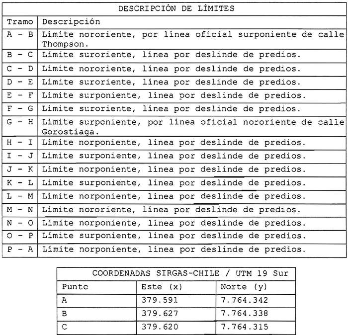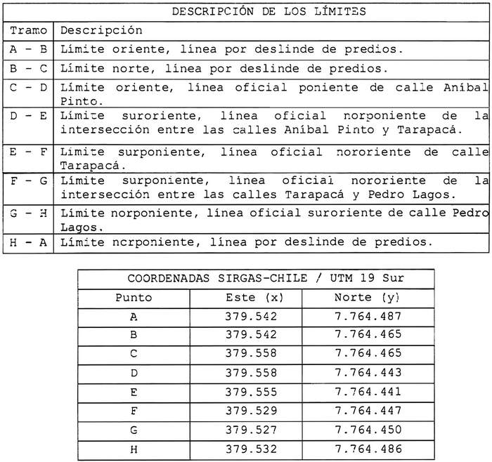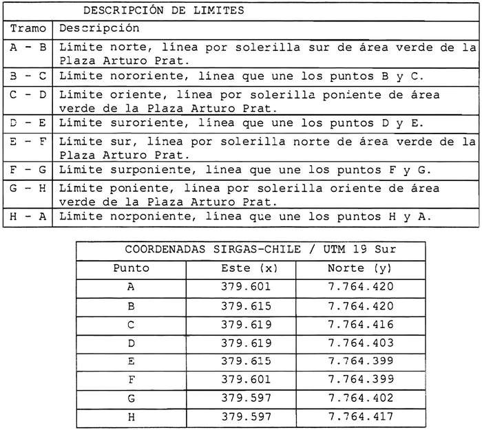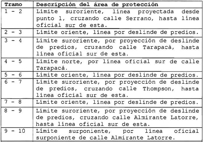Artículo noveno: Compleméntase el decreto N° 99 del 25 de febrero de 1988 del Ministerio de Educación, estableciendo como polígono de protección del Monumento Histórico edificio Sociedad Protectora de Empleados de Tarapacá, el espacio público que lo rodea quedará contenido dentro de la Zona Típica, totalizando una superficie de 291 m2, de acuerdo con el plano N° 29-2020, cuya descripción de límites y coordenadas son las siguientes: