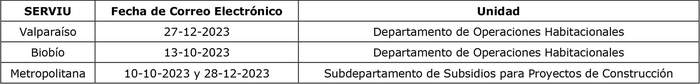 e) Que, las confirmaciones referidas en el considerando d) fueron realizadas mediante los correos electrónicos enviados por los Serviu respectivos, citados en la siguiente tabla adjunta: