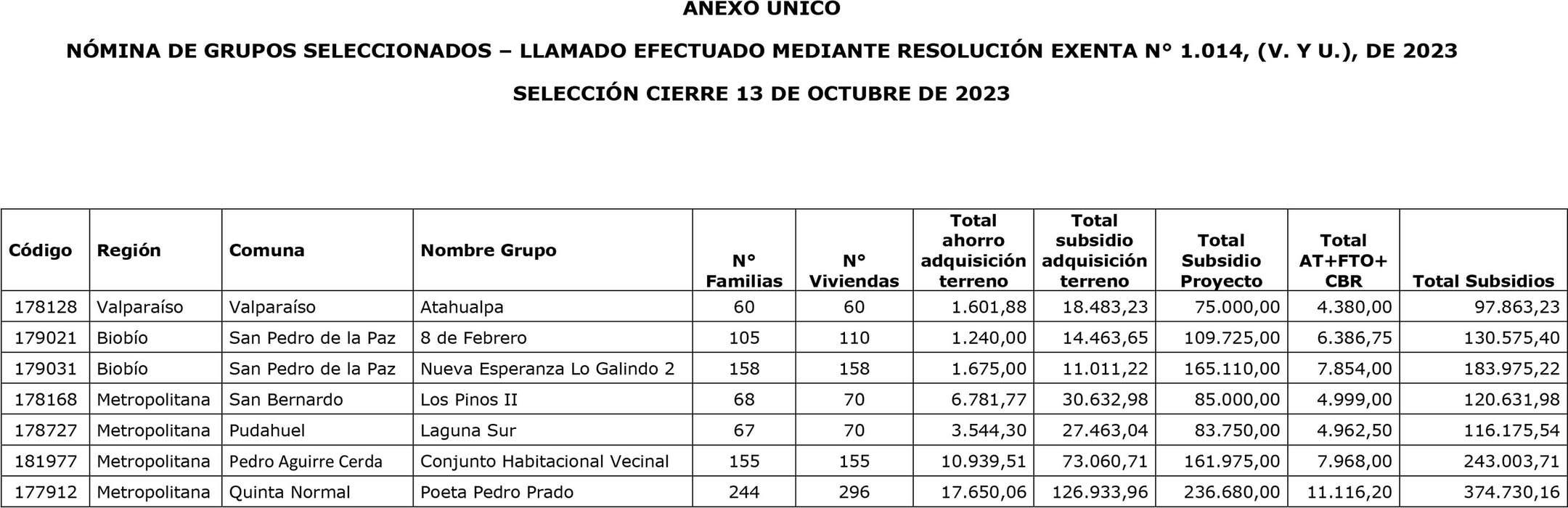 2. Apruébase la selección de los grupos organizados indicados en las siguientes tablas, con su respectivo financiamiento total, el cual incluye los servicios de asistencia técnica, fiscalización técnica de obras y aranceles del Conservador de Bienes Raíces, detallados en el resuelvo 3., para el otorgamiento de subsidios del Programa Habitacional Fondo Solidario de Elección de Vivienda en la alternativa de postulación colectiva, para adquisición de terrenos y desarrollo de proyectos de Construcción en Nuevos Terrenos y Pequeños Condominios, correspondiente al proceso de selección cuyo cierre de postulación se efectuó el día 10 de octubre de 2023, del Llamado efectuado por resolución exenta Nº 1.014 (V. y U.), de 2023: