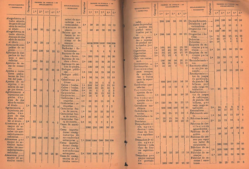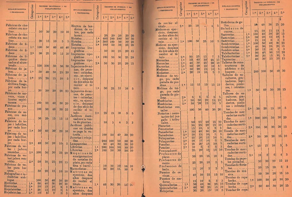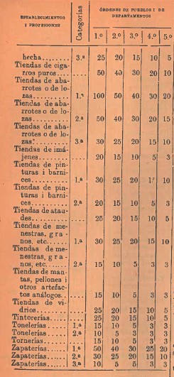 Art. 3.° Las patentes servirán por un año, i su valor será fijado en la siguiente tarifa para los diferentes establecimientos i profesiones segun su categoría, en los cinco órdenes establecidos en el artículo anterior: