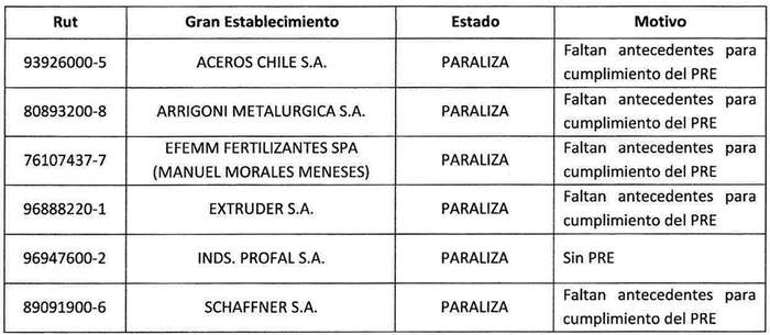 Segundo: Téngase presente que, según establece el PPDA RM, deberán paralizar todas las fuentes estacionarias correspondientes a calderas, procesos con y sin combustión, y hornos panaderos, pertenecientes al gran establecimiento industrial, definido en la tabla 1 del presente anexo, cuyo estado sea "Paraliza".
